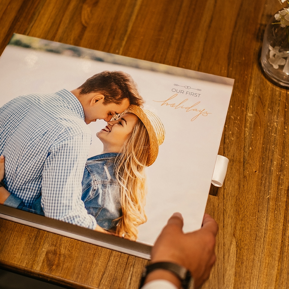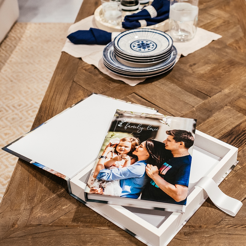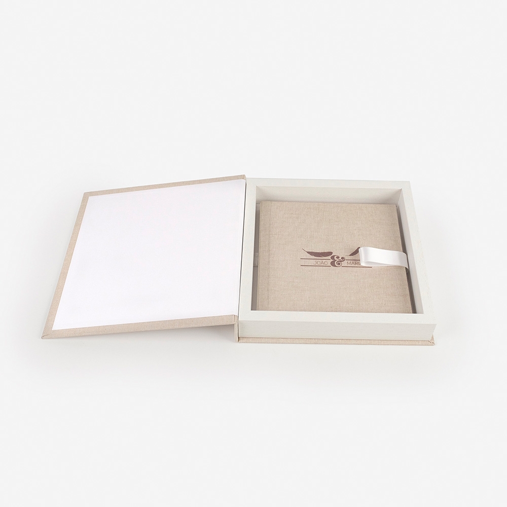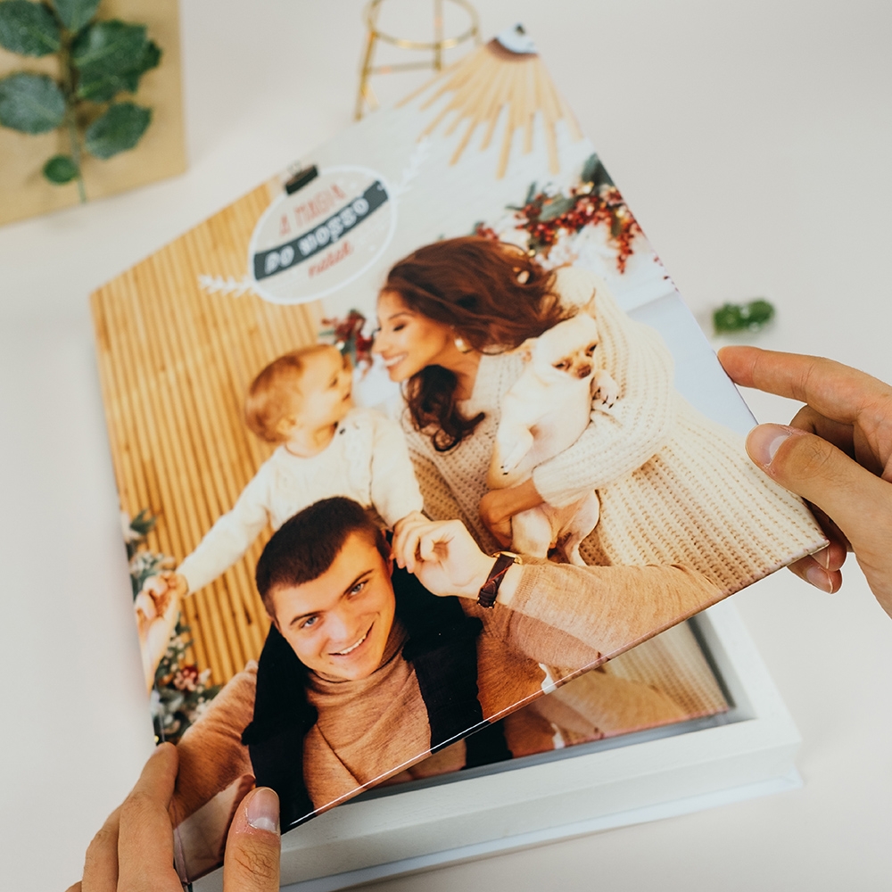 A tampa da Box pode ser personalizada com impressão UV — utilizando os nossos templates exclusivos — ou com uma janela quadrada que destaca uma fotografia de 10x10 cm. Ambas as opções oferecem identidade visual, requinte e permitem ao fotógrafo adaptar a apresentação ao estilo e emoção de cada projeto.