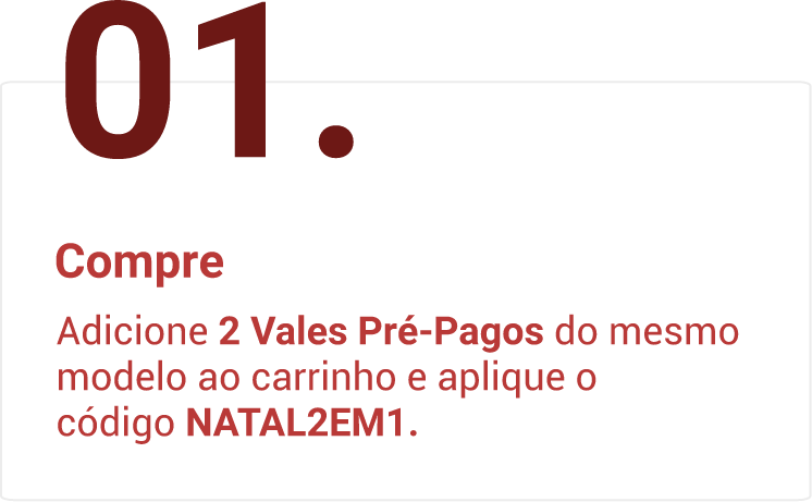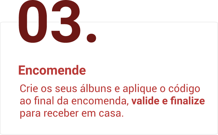 Basta adicionar 2 Vales Pré-Pagos de Álbuns do mesmo modelo no carrinho, submeter o código promocional NATAL2EM1 em “Vales de desconto” e clicar em “validar”. Você receberá no email informado dois códigos para encomendar os álbuns no formato que escolheu. Eles também ficarão disponíveis na sua conta em “Pré-Pagos”. Depois, basta fazer login no site e começar a criar o seu álbum. Ao final da encomenda, deverá inserir os dois códigos para finalizar e receber seus produtos no endereço informado.